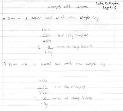 Pupils at Alice Smith International School in Kuala Lumpur, Malaysia also worked on the Oranges and Lemons problem. They agree with Luke. One of the pupils, Kevin, shows all of the possibilities. They prove that there are in fact two possibilities but that there are no more.