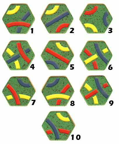 4. Continue as above up to all ten tiles. All other touching links must match up in colour too.