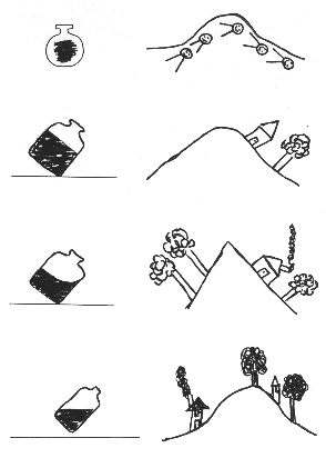 The development of the co-ordination of horizontal and vertical planes is illustrated in the sequence of drawings below (McNally pp.45-46). Children ranging from 4 years to 10 years were asked to draw liquid in a tilted jar on a table, and to draw people or trees on a hillside. The youngest drawer clearly demonstrated Topological thinking, with the liquid simply shown inside the jar, and the