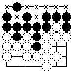 Territory refers to empty points surrounded: we see eight points of territory, marked 'x', in this diagram, belonging to Black. White can be seen to have ten points of territory. Adding up, Black has 8+3 = 11 and White has 10+5 = 15. Again White wins, this time by four rather than three.