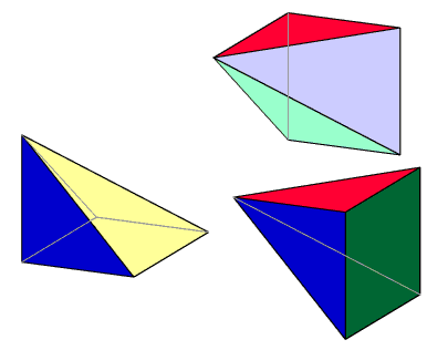 When we think of a pyramid, we usually think of one where the vertex (the top point) is above the centre of the base, a right pyramid . However in this article, we will begin with a yangma. Yangma is an ancient Chinese name for a rectangular-based pyramid whose vertex is vertically above one of the vertices of the base. We will take a yangma with a square base of side length $a$, and height also length $a$. Three of these can be fitted together to form a cube.