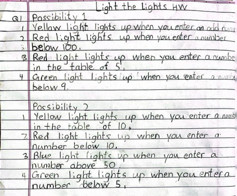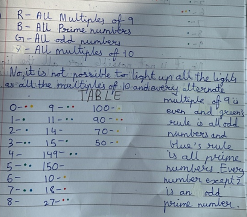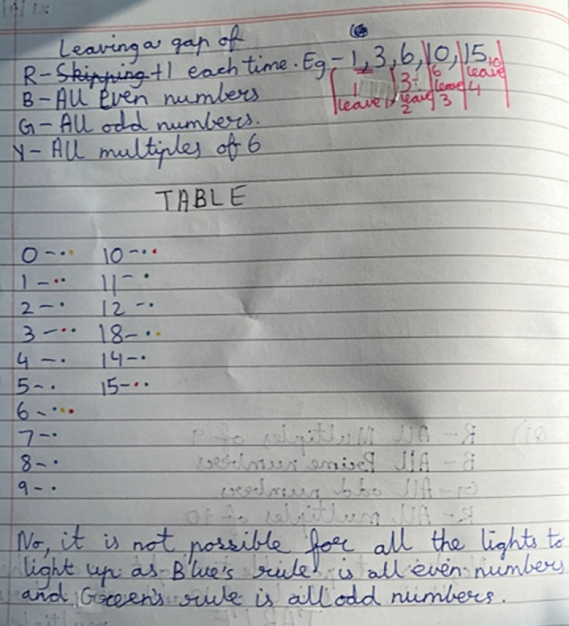 We received a lot of solutions from the students at Ganit Kreeda in Vichar Vatika, India. Ruhi also found some cases where the lights could never all light up at the same time: