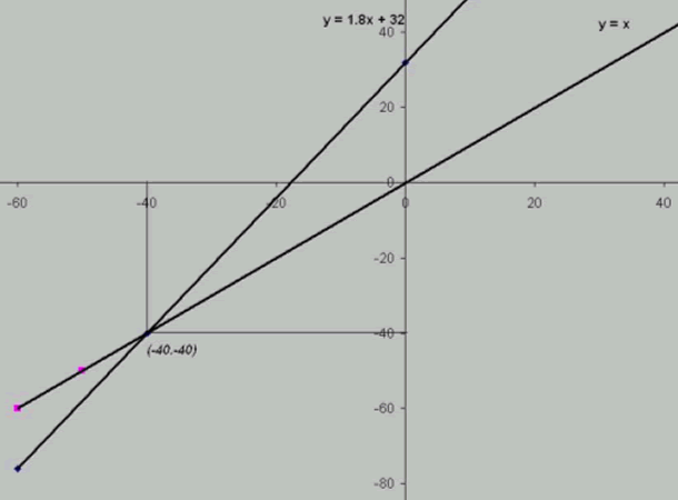 Because of this, Farenheit and Celsius are equivalent ONLY at $-40$ degrees.