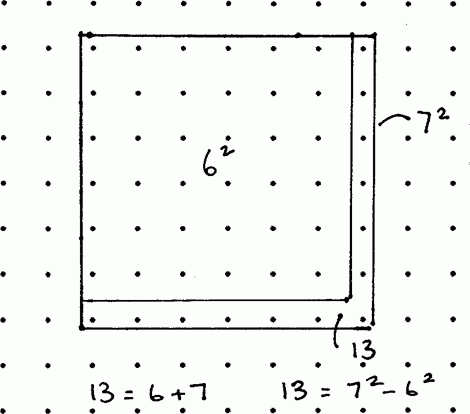 In the square of dots you can imagine the"L" of any odd number and if you take the square for the odd number below it from the square of the odd number you get the number you stated with. To find the two squares you have to find half the odd number and round it up and down. So half of $13$ is $6.5$ so the two squares have sides $7$ and $6$.