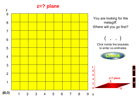The metagiff is hiding at a point on the three dimensional grid, so his location is specified by three coordinates (x,y,z).