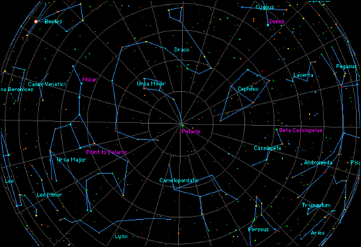 When observing the night sky, it quickly became apparent to ancient people that a group of stars appear to rotate around a particular star in the sky, called the Pole Star. In the Northern hemisphere today, this star is located by using the 'pointers' of the constellation the Great Bear (Ursa Major) seen on the left of the picture below.