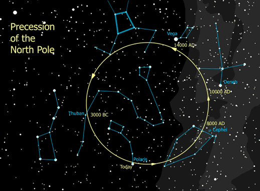 The Earth's axis of rotation is very slowly, but continuously, changing. As the projection of the axis moves around the celestial sphere, the role of the North Star changes from one star to another. This movement of the axis, called precession, is very slow and takes about 26,000 years to complete a cycle. This phenomenon is said to have been discovered by the Greek astronomer, Hipaprchus