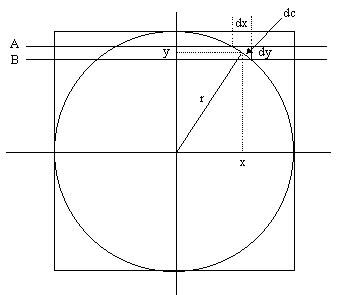 In this cross section, A and B are planes at a small distance dy apart, cutting the sphere and circumscribing cylinder. The 'triangle' with sides dy, dx and dc is so small that we can treat the arc dc as if it were a straight line and the hypotenuse of this triangle. This tiny triangle is similar to the triangle shown with sides $x, y$ and $r$ so that $${dy\over dc} = {x\over r}.$$