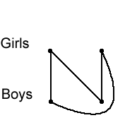 Here's a slightly different party game. This time, there are the same number of girls as boys at the party. Now you have to arrange yourselves so that there's a ribbon between each girl and each boy (but we don't have any girls sharing a ribbon, or any boys sharing a ribbon). Again, you have to try to do this so that the ribbons don't overlap. This would be easy if there were only two girls and two boys: