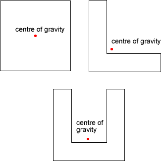 All this sounds straightforward but the tricky point is the quantity $H$ - what exactly is it? It is not the height that is cleared by the jumper. Rather, it is the height that the jumper's centre of gravity is raised, and that is rather a subtle thing because it makes it possible for a high jumper's body to pass over the bar even though his centre of gravity passes under the bar. When an object has a bendy shape it is possible for its centre of gravity to lie outside of the body. One way to locate the centre of gravity of an object is to hang it up from any point on the object and drop a weighted string from the same point, marking where the string drops. Then repeat this by hanging the object up from another point. Draw a second line where the hanging string now falls. The centre of gravity is where the lines of the two strings cross. If the object is a square then the centre of gravity will lie at the geometrical centre but if it is L-shaped or U-shaped the centre of gravity will not lie inside the boundary of the body at all.