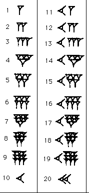 The Babylonians were the first people to come up with a more sensible way of representing fractions. In fact they did this before the Romans' methods but there was no contact between the two civilisations. The Babylonians lived in the country we now call Iraq in the Middle East. Their number system was organised around the number 60, so we say it is base 60. In other words they grouped numbers into 60s, whereas we group into 10s. (We still use base 60 in our measurement of time and angles.) However, they also grouped into 10s and so only had two symbols, one for a unit and one for a 10: