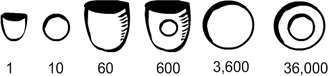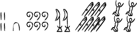 Here are some hieroglyphs on King Narmer's War Club (about 3000 BC). Along the bottom, and outlined in red, the hieroglyphs tell how many bulls, goats and human prisoners the king took. Can you work it out?