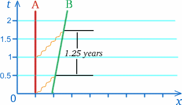 message is sent exactly a year later. When this radio signal has travelled for half a year to where Ben the astronaut received the previous signal, the rocket has moved one-fifth of a light-year further on, so this signal has to travel for longer to catch up with the rocket; in fact, the time measured by Alf when the signal reaches the rocket is three-quarters of a year after it was sent - see