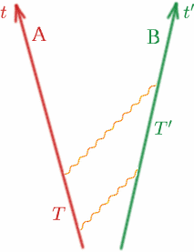 Alf sends a light signal and then another at time $T$ later. Ben receives the two signals at times $T^{\prime}$ apart, according to his clock. Then we define a quantity $K$ by \begin{equation} {K} = {T^{\prime}/T}. \quad (8) \end{equation} Note that if Alf and Ben were moving with the same speed (in the same direction!), $K$ would be one. We shall see