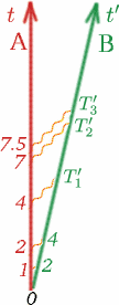 We need to make some assumptions about this number $K$ in order for it to be useful to us. We assume first that when Alf and Ben are moving with constant speeds, then $K$ does not depend on when $T$ and $T^{\prime}$ are measured, nor does it depend on how big $T$ is. So for example, if Alf waits twice as long between sending light signals, $K$ will be the same. See if you can fill in the numbers