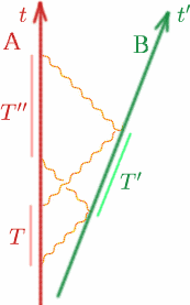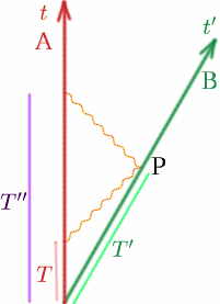 First let's imagine our usual two observers travelling away from each other with constant speed $v$. Let's suppose that when they are together, they both set their clocks to $t = 0$. At time $T$ by his clock, Alf emits a radio signal; Ben reflects it back at time $T'$ by his clock and Alf gets it back again at time $T^{\prime\prime}$ by his clock. Let's draw a picture as usual.