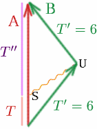 Now look at what happens on Brigitta's return journey. What is $T^{\prime\prime}$? We have $T^{\prime}=6$, $K=1/3$ and \begin{equation} {T^{\prime}} = {K T^{\prime\prime}}, \quad (29) \end{equation} so $6=T^{\prime\prime}/3$ and $T^{\prime\prime}=18$. Therefore the total time measured by Albertina is $T+T^{\prime\prime}=20$ years, so she is 20 years older when they meet, whereas Brigitta is only