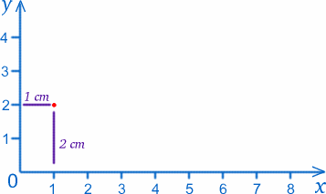 For example, the origin has $x=0$, $y=0$. The point $1cm$ from the y-axis and $2cm$ from the x-axis has $x=1$, $y=2$ (I really do have these the right way round!).
