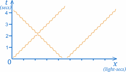 We are now going to do something rather strange to our graph. In the theory called special relativity , which is what makes it interesting to think about about twins and space travel, we often need to plot light rays on our graphs. Now light rays travel in empty space with a constant and very large (but finite) speed; a ray of light reaching you from the