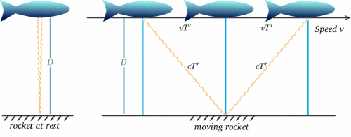 For the moving rocket, the light is reflected from the mirror at the half-way time between when the signal is sent and when it is reflected back. From the stationary rocket, the travel time appears to be $2T^{ \prime}$ say. We can work this out using a very important theorem (a fancy name for something that has been proved to be true in mathematics!) - that of Pythagoras.