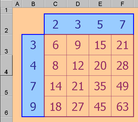In the illustration above, C2 is the factor from the top row and B3 is the factor from the left hand column. The dollar sign, \$, used in the C3 formula, ensures that when the formula is copied from C3 across the whole C3:F6 range the first factor will continue to be taken from row 1 and the second factor will still be taken from column A.