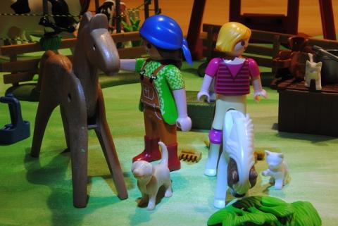 Adults could provide small world play figures and an area with separate compartments or boxes, fences, sand, etc.