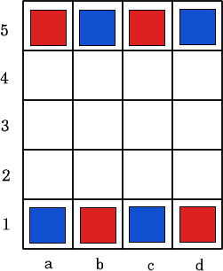 The game starts with the 4 red and 4 blue pieces arranged on a 4 by 5 board as shown.