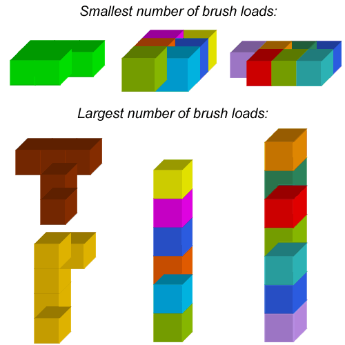 Counting the faces to be painted comes to 15, so 15 Brush Loads (or BLs) are needed. Remember we're only counting visible faces, so not those that are touching the surface where the cubes are placed.