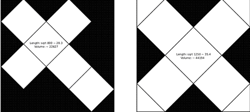 To find the length $E$ of an edge of the cube divide the paper into 5 by 5 and use Pythagoras' theorem. So $E^2 = 20^2 +20^2$ and $E=\sqrt{800}$ or approximately 28.3, and the volume is 22627. Six of the eight non-retroflex vertices touch the edge of the square, and the net fills 48 per cent of the square.