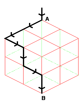 The diagram shows a skeletal view of a 2 by 2 by 2 cube with one route 'down' the cube.