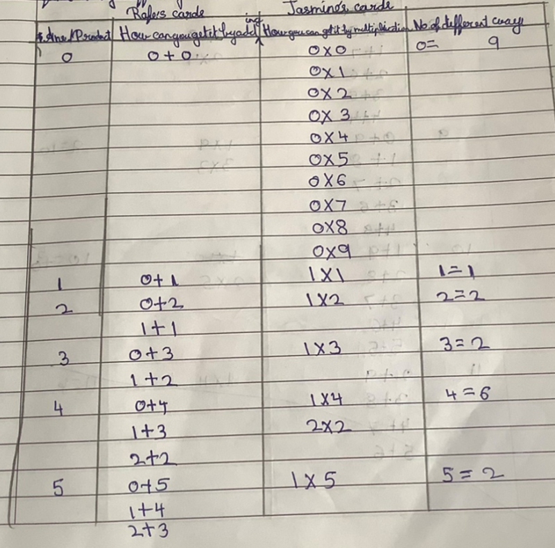 Tejas, Valerie, Varun, Kaumudi, Dhwani, Ira, Prathamesh, Adhrit, Delissaa and Riyansh from Ganit Kreeda in Vichar Vatika, India also found the solution where one pair of numbers is 2 and 3 and the other is 1 and 5. Adhrit drew a table to find all the possible ways of pairing up the cards so that the sum of Rafe's cards is the product of Jasmine's: