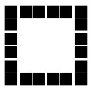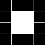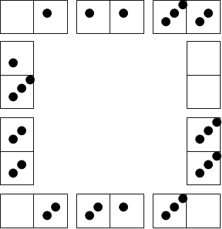 10 blank dominoes arranged into a square, with 3 dominoes on 2 of the sides which are opposite each other, and 2 dominoes on the other 2 sides which are opposite each other.