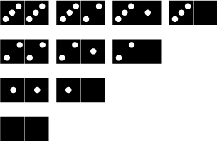 Dominos with: 3 and 3 dots; 3 and 2 dots; 3 and 1 dots; 3 and 0 dots; 2 and 2 dots; 2 and 1 dots; 2 and 0 dots; 1 and 1 dots; 1 and 0 dots; 0 and 0 dots.
