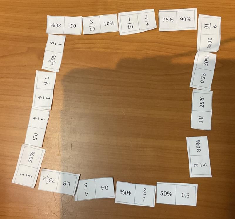 We first started making the bottom left doughnut. We used the domino that says $10%$ and $\frac{3}{10}$ at first. Then, we noticed that $30%$ is equivalent to $\frac{3}{10}$. After that, we calculated that $90%$ is equivalent to $\frac{9}{10}$. $\frac{3}{4}$ is equivalent to $75%$ and $\frac{1}{10}$ is equivalent to $10%$. We easily made one doughnut! We did this for the other doughnuts and we were easily able to make four doughnuts.