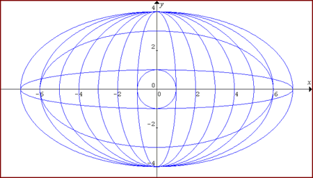 x varies between -a and a, and y between -b and b, I drew all other curves in the same manner. The equations of the other 8 graphs are: $$\frac {x^2}{7^2} + \frac {y^2}{4^2} = 1 \quad (4)$$ $$\frac {x^2}{5^2} + \frac {y^2}{4^2} = 1 \quad (5)$$ $$\frac {x^2}{4^2} + \frac {y^2}{4^2} = 1 \quad (6)$$ or , i.e. a circle of radius 4. $$\frac {x^2}{3^2} + \frac {y^2}{4^2} = 1 \quad (7)$$ $$\frac {x^2}{2^2} + \frac {y^2}{4^2} = 1 \quad (8)$$ $$\frac {x^2}{1^2} + \frac {y^2}{4^2} = 1 \quad (9)$$ $$\frac {x^2}{6^2} + \frac {y^2}{3^2} = 1 \quad (10)$$ $$\frac {x^2}{7^2} + \frac {y^2}{1^2} = 1 \quad (11)$$