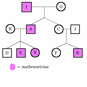 A. My father is a mathematician. B. So is mine. C. And mine. D. And mine. E. Mine too. F. Neither of my parents is a mathematician but my one and only brother is. G. Only one of us females is a mathematician but it's not me. H. I've given birth to two mathematicians, no more and no less. I. I am the oldest mathematician in the family. J. My brother-in-law is a mathematician. C. My husband isn't. D. Exactly one of my cousins is. G. B is my granddaughter. |