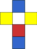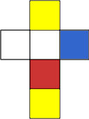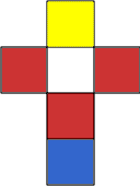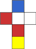 Incidentally, there are 3 red flaps, 2 yellow flaps, 2 white flaps and 1 blue flap in line 2. Assuming that they can be folded over into the tower or onto the top and bottom, the faces left in columns 1234 will make up the walls of the tower.