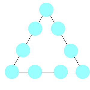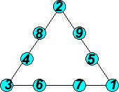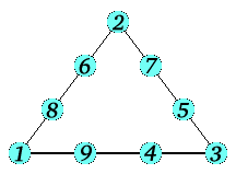 Place the digits 1 to 9 into the circles so that each side of the triangle adds to the same total.
