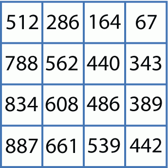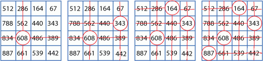 Circle any number in the matrix, for example, $608$ as below. Draw a line through all the squares that lie in the same row and column as your selected number.