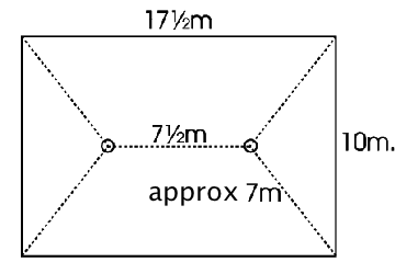 A rectangular field measuring 17.5 metres by 10 metres has two posts 7.5 metres apart with a ring on top of each post. The posts are approximately 7 metres from the nearest corners as shown in the diagram. You have two quarrelsome goats and plenty of ropes which you can tie to their collars and you want them to be able to graze the whole field between them. How can you secure them, using the posts, so they can't fight each other, and how much rope is needed?