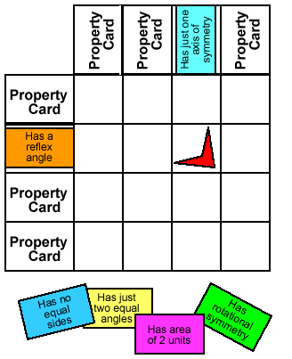 The game could be played as a whole class - shuffle and arrange the property cards on the board so that everyone has the same question. Groups of 3 or 4 then work together filling in the grid and checking each others work. A correct shape or gap will earn 10 points, but each incorrect shape or gap will lose 10 points. After a set time, all the grids are displayed, and students try to find errors in the other groups' work, in order to establish the scores and the winners. They may be ready to try the problem as stated after this!