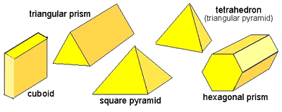 A selection of 3-d shapes including a cuboid, a triangular prism, a square pyramid, a tetrahedron, and a hexagonal prism.