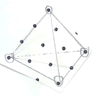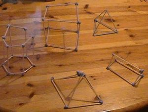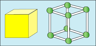 A solid cube and a cube with sides made of straws and with balls of modelling clay on the corners.