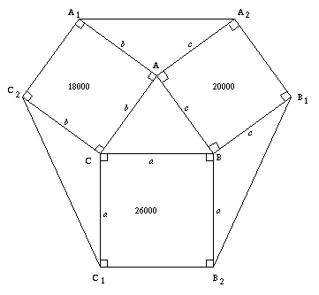 Similarly we can prove triangle $AA_1A_2$ and triangle $BB_1B_2$ are also equal in area to triangle $ABC$. Therefore the four triangles are equal in area and we only need to work out one of these areas.