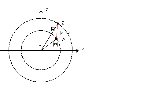 Draw two concentric circles with centres at the origin and radii $|z|$ and $|w|$ and suppose, without loss of generality, that $|z|> |w|$ then $z$ lies somewhere on the outer circle and $w$ lies somewhere on the inner circle.