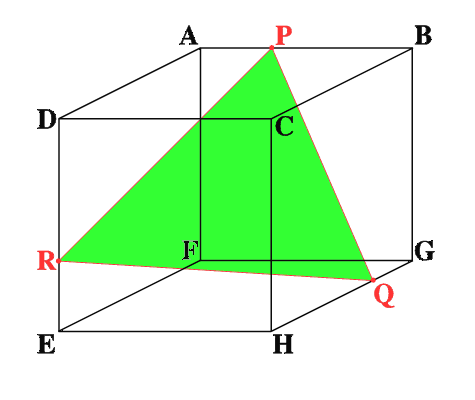 ABCDEFGH is a 3 by 3 by 3 cube. Point P is 1/3 along AB (that is AP : PB = 1 : 2), point Q is 1/3 along GH and point R is 1/3 along ED.