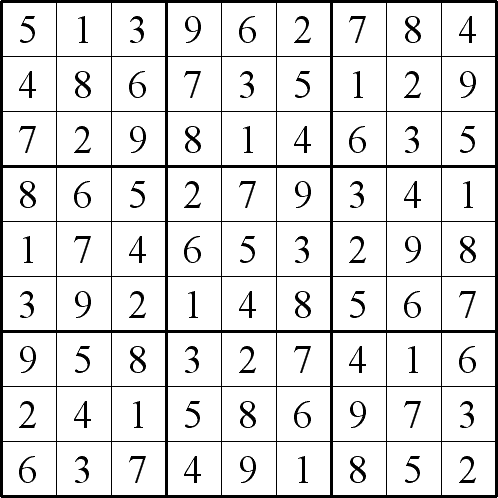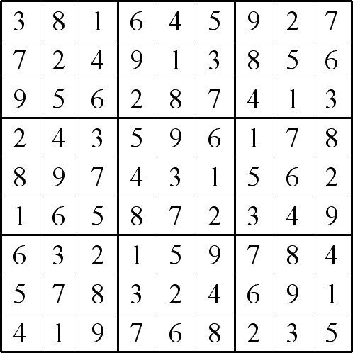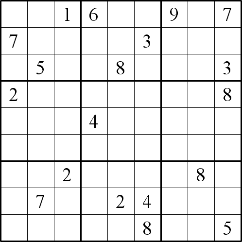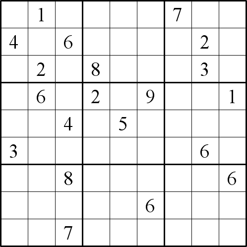 As with all the Sudoku puzzles published here, the object is to fill in the whole of each 9x9 grid with numbers 1 through 9 (one number per cell) so that each horizontal line, each vertical line, and each of the nine 3x3 squares (outlined with the bold lines) contain all the nine different numbers 1 through 9.